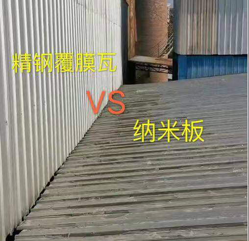 上圖是精鋼覆膜瓦和納米板使用半年后的對(duì)比,如圖所示:精鋼覆膜瓦完好如初,但是納米板表面已經(jīng)開始脫皮、生銹和腐蝕。